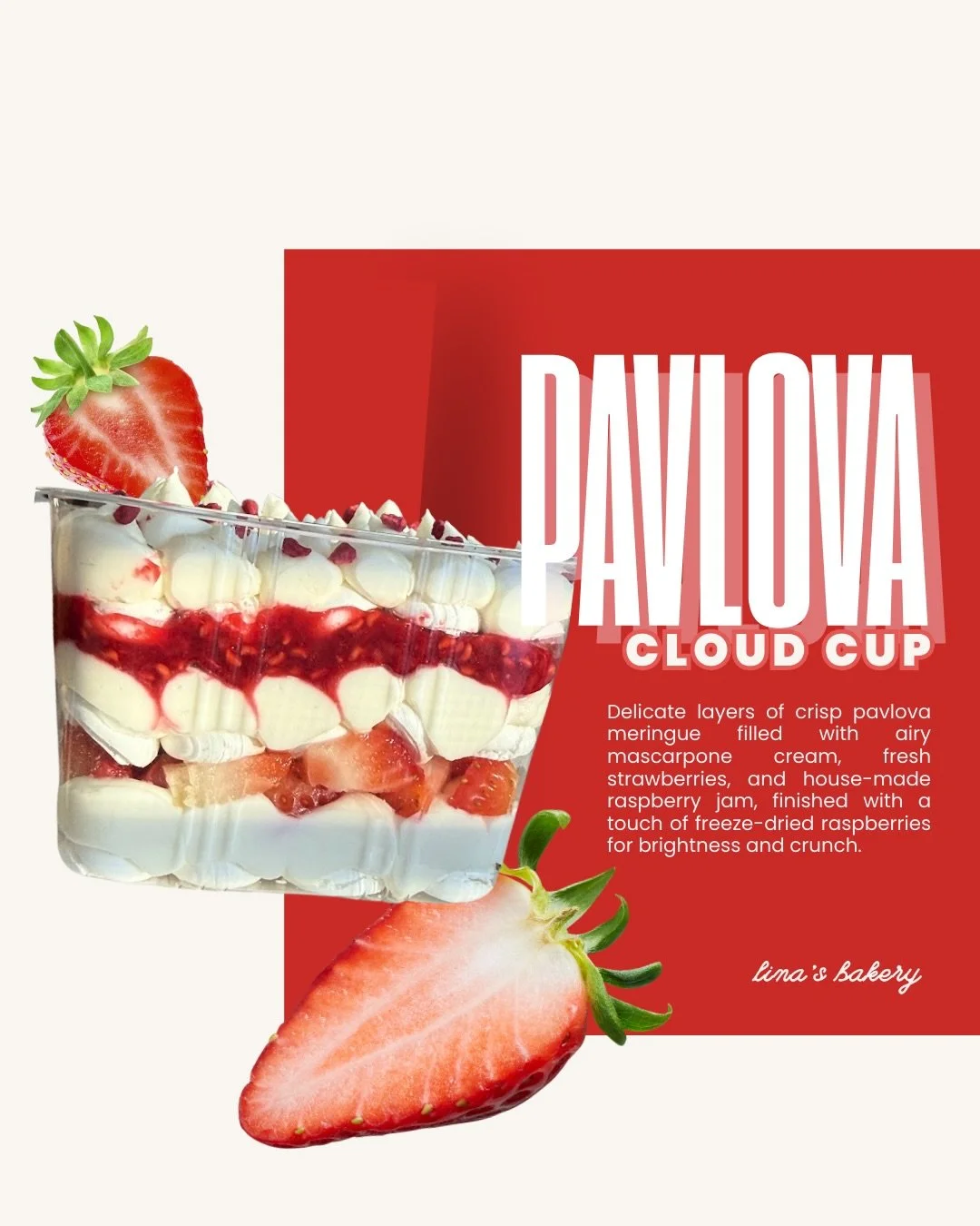 Pavlova, tiramisu, and strawberry cloud cake cups.